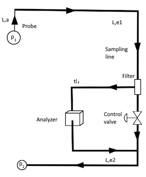 The lag time of the medium from the sample point to the analyzer can be calculated. The pressures at the sampling point and at the return, the probe line (inner diameter, pipe roughness, resistances and length), the sampling line (inner diameter, pipe roughness, resistances and lengths before and after the analyzer) and the lag time from the filter to the analyzer can be taken into account. The lag time can be calculated as a function of the desired flow rate or as a function of the control valve parameters (Cv value or pressure difference).