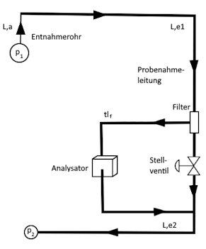 Die Laufzeit des Mediums von der Druckentnahme bis zum Analysator kann berechnet werden. Dabei können u.a die Drücke am Entnahmepunkt und an der Rückführung, das Entnahmerohr (Innendurchmesser, Rohrrauheit, Widerstände und Länge), die Probenahmeleitung (Innendurchmesser, Rohrrauheit, Widerstände und Längen vor und nach dem Analysator) sowie die Laufzeit vom Filter bis zum Analysator berücksichtigt werden. Die Laufzeit kann abhängig vom erwünschten Durchfluss oder von den Kenngrößen des Stellventils (Kv-Wert oder Druckabfall) berechnet werden.